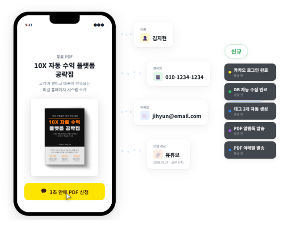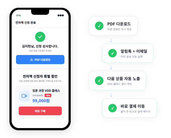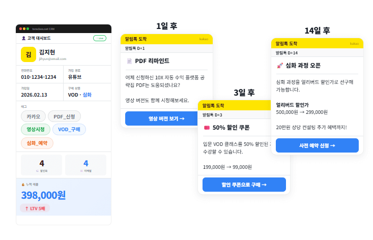 클릭퍼널스의 판매 자동화 구조를 한국 시장에 맞게 구현했습니다. 카카오 고객 수집, 토스 결제, 알림톡은 클릭퍼널스에서 불가능합니다.